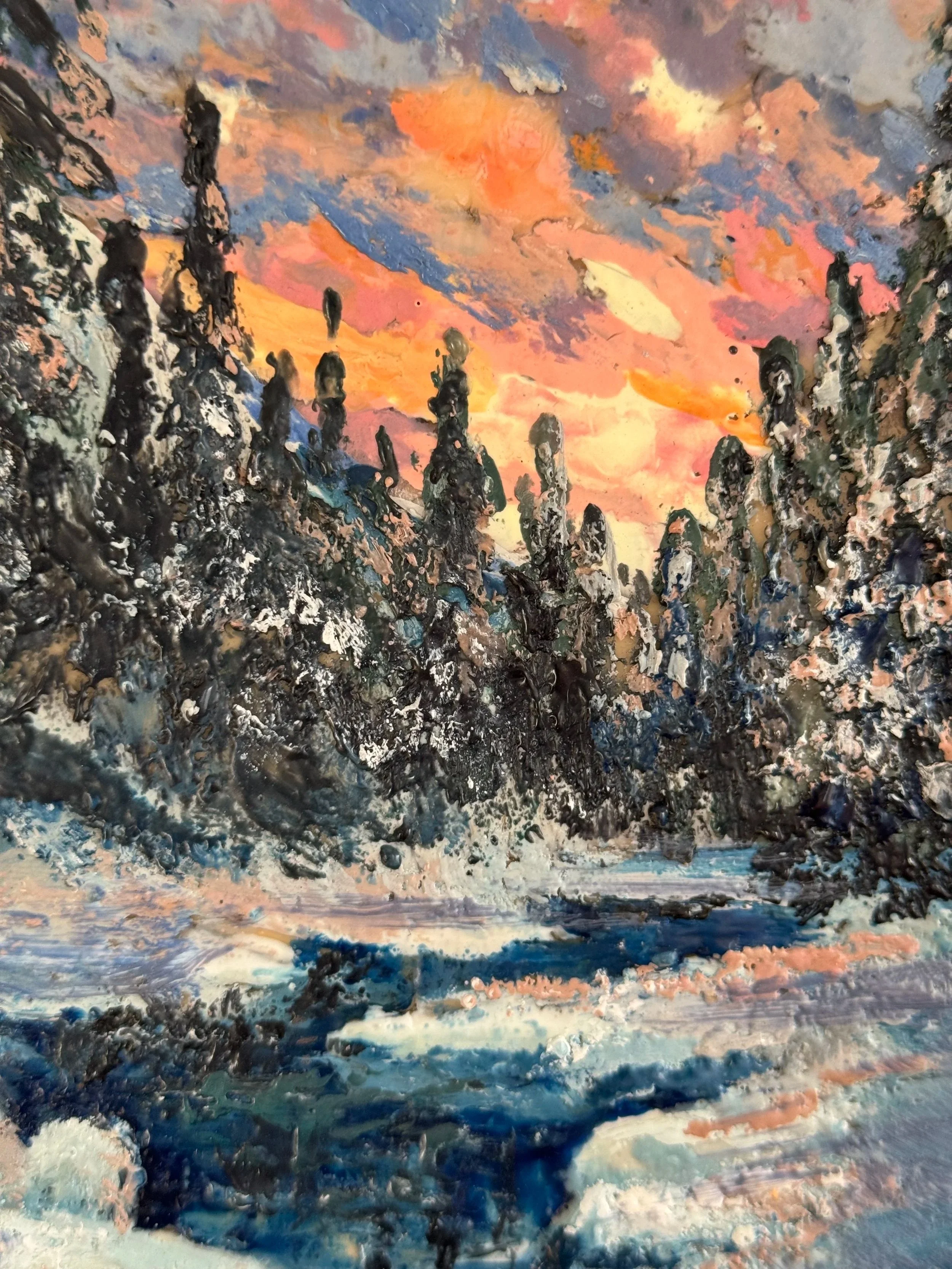 Tricia’s landscape paintings of places she has visited throughout the United States are done in Encaustic on cradled panel. This is a medium combining Natural Bees Wax, Damar Resin and pigments and was originally invented by the ancient Greeks in 4th century BC. All work is done using a heated palette set to 180 degrees to keep the medium melted. A heat gun or torch is used to set the medium between layers. The Beeswax is sustainably collected and processed at Black Birch Farm Apiaries in Essex County, Massachusetts. Damar Resin is from trees in South-East Asia and is used to harden the bees wax and raise its melting point.